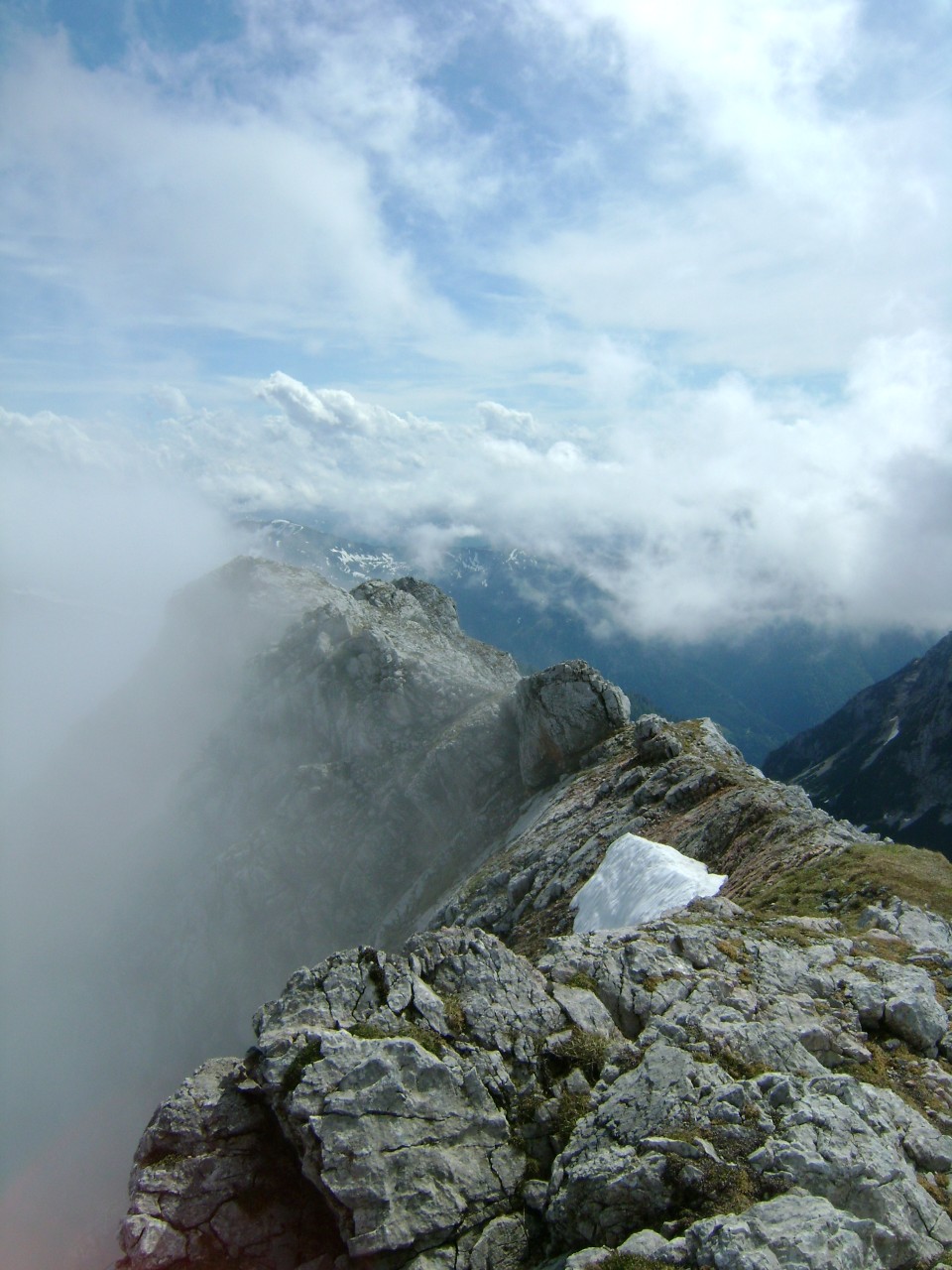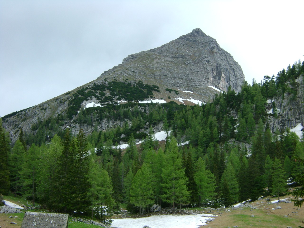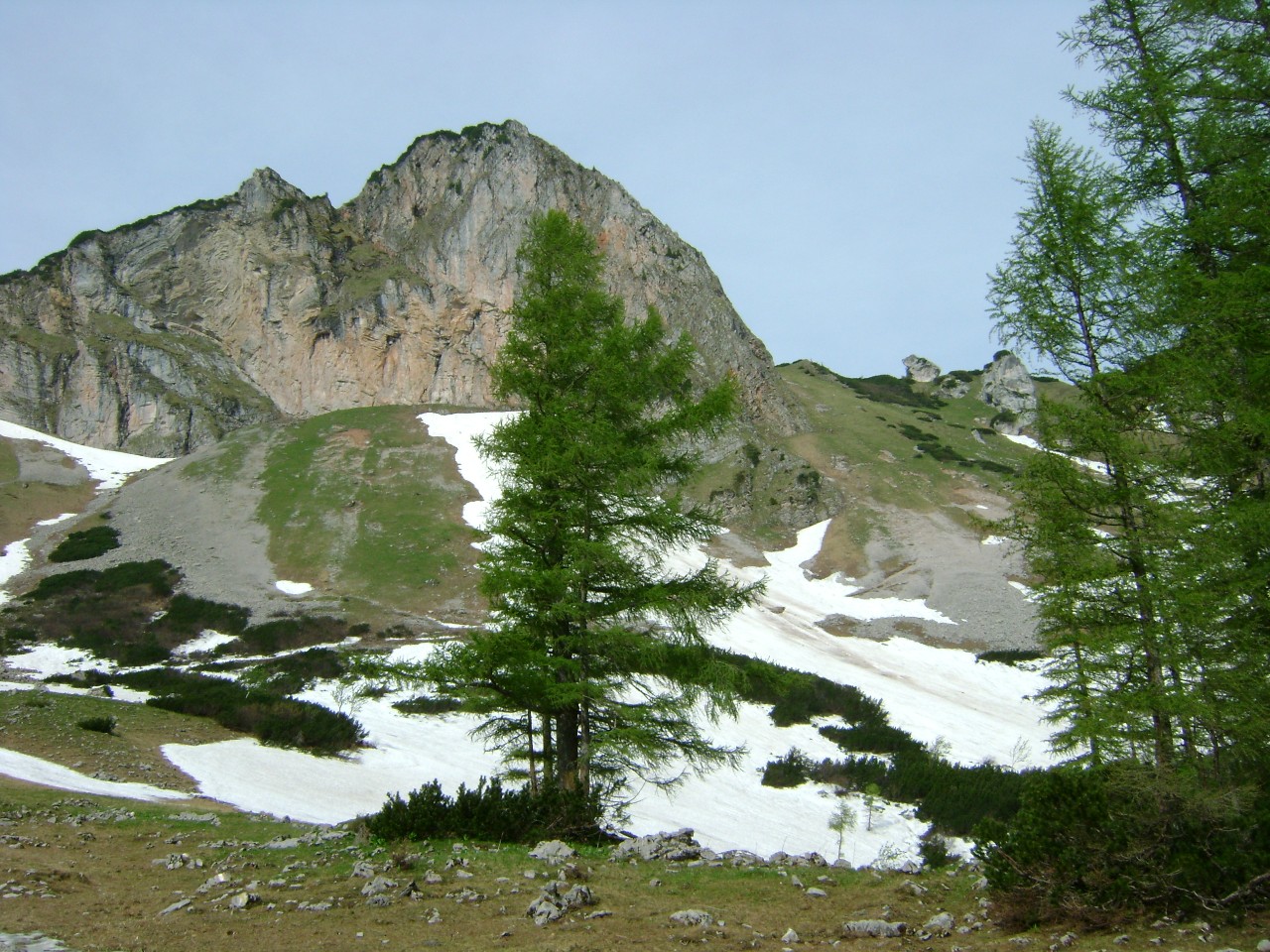 Na začátku června jsme se rozhodli vyrazit letos poprvé do alp. Vzhledem k počasí jsme vybrali nižší kousek – Hoch Zinodel – 2191 m.n.m. v Ennstalských alpách. Jelikož by nemělo jít o nic náročného, vzali jsme na výlet i holky. Ve čtyřech jsme tedy asi ve 4:00 ráno vyrazili z Prahy a pohodlně kolem osmé vystupovali z auta ve vesničce Johnsbach, kde je parkoviště pro pár aut hned u nástupu na značenou cestu. Těsně přen naším příjezdem sprchlo a my se tak drápali mokrou trávou po loukách vzhůru k lesu. Cestou jsme museli překonat stádo krav (dle Matěje hejno krav) bez ztáty kytičky jsme začali stoupat lesem výš a výš. Po prudkých stoupáních vždy přišlo čas oddechu v podobě pěkného paloučku obehnaného skálami a stráněmi, které jsme viděli skrz mlhu jako někde v džungli. Cesta dál stoupala a my narazili na první sněhová pole. Po tom , co jsme se vydrápali prudkým kopcem do řidšího lesa, jsme šli jakýmsi korytem prakticky už jen po špinavém sněhu plným jehličí, ale bez boření, takže bez problému.