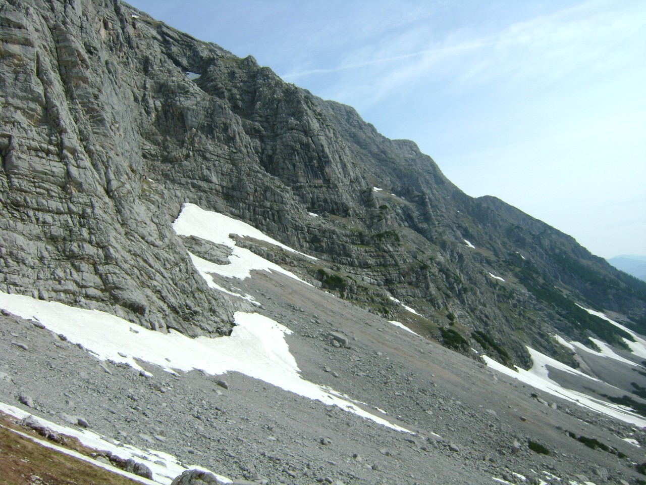Když jsme vyšli z lesa, protrhala se oblačnost a my konečně viděli kopce a skály kolem nás v celé jejich kráse. Šla příjemně jen s nepatrným převýšením po paloučcích a my jsme došli až pod chatu Hesshutte. Cesta opět stoupala a my šli nyní už přes strmější sněhová pole, ale bez problémů se dají přejít.