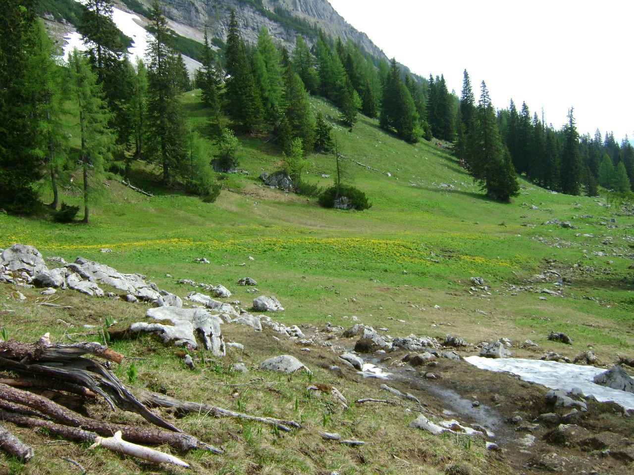 Ráno jsme kolem sedmé vyrazili stejnou cestou zpět a asi po 300m odbočili doleva do sedla směr jezero Sulzakrsee. Sedla jsme dosáhli asi po hodince svižné chůze, zamávali Hoch Toru a začali sestupovat do údolí směrem k jezeru. Vzdálenost, kterou jsem odhadoval okem odborníka na cca. 40 minut jsme šli asi dvě hodiny, protože ledovo/sněhová pole byli tentokrát poměrně nebezpečná a my několikrát ztratili cestu pod sněhem. A taky nás ještě zdržovali kamzíci a svišti, protože jsme na ně pořád museli čuečet, jak se prohání na okolních kamenných polích. Nakonec jsme se dostali do údolíčka, popili krásně studenou vodu z potůčku pramenícího z ledovce a spokojeně jíž pokračovali příjemnou cestou přes malé louky a lesíky dál údolím. Po chvilce už jsme nešli po sněhu, ale mezi krásně rozkvetlými květy všemožných rostlin, což já jsem tak neocenil, Bára ale říkala že jsou to pěkně kytky J